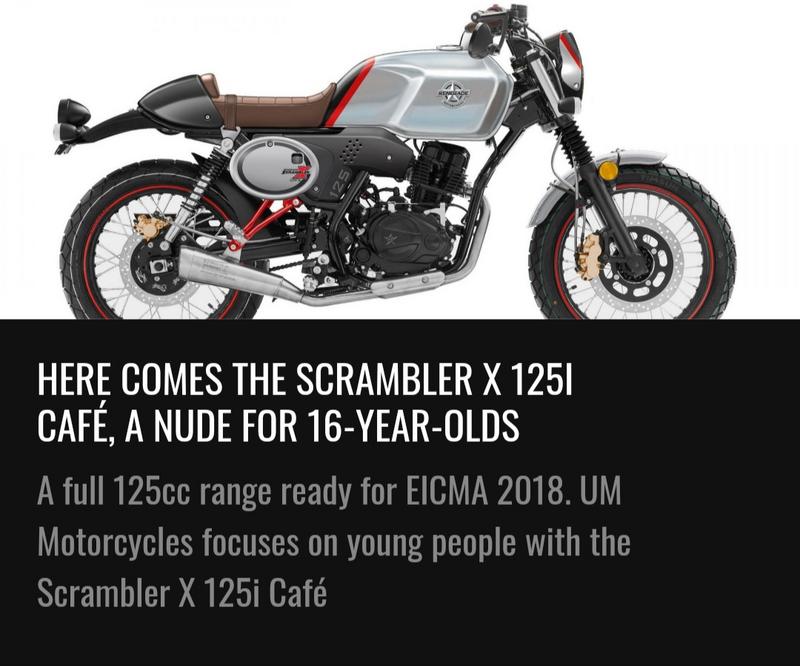 "MAGGIORENNE The young House of Miami UM Motorcycles (over 2000 distributors in 30 countries) grows up at the age of 18 and celebrates the great importing for Italy of an entire 125 ccrange . The "small" American dream with two wheels, only for displacement, is entrusted to UM Italia, which will presentits new 7 models at EICMA 2018 . In addition to the Renegade Commando Classic , presented a month ago pre-EICMA, will be present on the UM Italia stand (Hall 22 - Stand S24) a truly interesting naked design. It is called X 125i Café and is a Scramblerwith a distinctly vintage 60s style touch with attention to the smallest details, just like a motorcycle with a higher displacement.