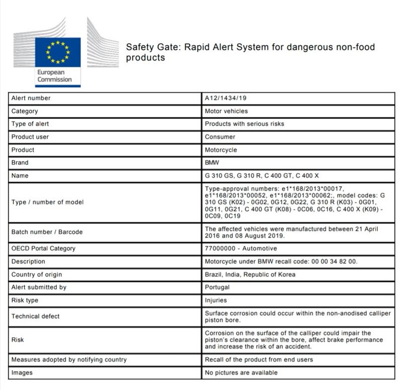 "BMW – G 310 GS, G 310 R, C 400 GT, C 400 X. The affected vehicles were manufactured between 21 April 2016 and 08 August 2019. Surface corrosion could occur within the non-anodised calliper piston bore. Corrosion on the surface of the calliper could impair the piston’s clearance within the bore, affect brake performance and increase the risk of an accident."