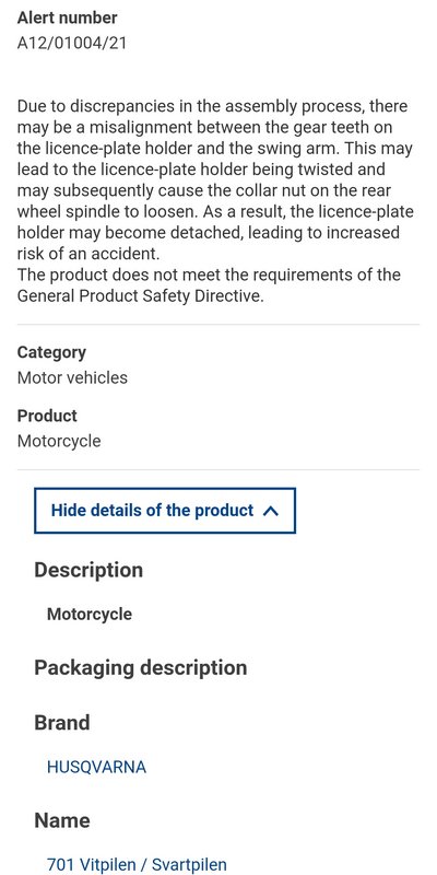 "Husqvarna - 701 Vitpilen / Svartpilen. Devido a discrepâncias no processo de montagem, pode haver um desalinhamento entre os dentes da engrenagem no suporte da placa e o braço oscilante. Isso pode fazer com que o suporte da placa seja torcido e, subsequentemente, fazer com que a porca do colar no eixo da roda traseira se solte. Como resultado, o suporte da placa pode-se soltar, aumentando o risco de acidente."