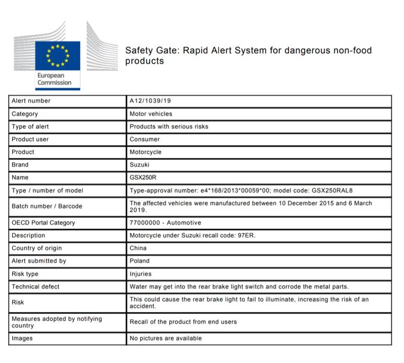 Recall: Suzuki GSX-250R (unidades de 2015 a 2019)