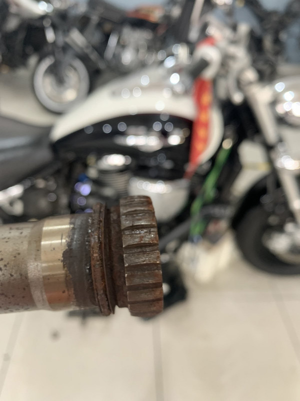 Ao fim de uns valentes Kms também precisa de um mecânico, porque senao ganha corrosao (geralmente é uma oxidacao do tipo galvanico que pode ser acelerado com a presenca de humidade) que vai fazer com que os estriados das engrenagens desapareçam. Isto acontece por ex na Tmax e tambem na BMW GS 1200. Erradamente e por ignorancia, oico muita gente criticar a BMW por este facto, mas o unico ponto ponto em que eles falham é em prever na manutencao a intervencao no cardan, porque pode acontecer em praticamente todas as marcas.... estas 2 fotos sao de uma Suzuki Intruder que teve de levar Cardan e luva novas  :nice: :nice: