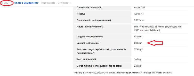 Numa pesquisa pelo site da marca, é ali indicada a largura da R1250RT com as malas.