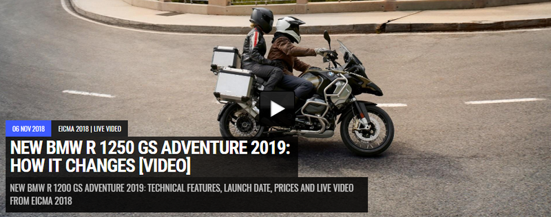 AVAILABILITY AND PRICE The arrival of the new BMW R 1250 GS Adventure 2019 is scheduled for the first quarter of 2019 , in Ice Gray color or in the Exclusive and HP versions: at prices slightly higher than those of the current R 1200 GS Adventure 2018 which starts from € 18,700. Click the link the other BMW news at EICMA 2018 ."