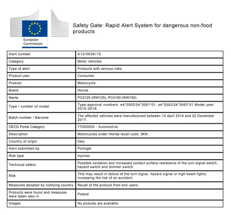 Recall Honda: PCX125 (WW125), PCX150 (WW150)