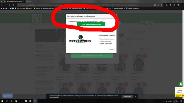 Como de costume, entramos no site e aparece a tal box a dizer que não fazem envios para fora de Espanha. Depois de fechar essa box, aparece uma outra com um codigo de desconto ( relativo aos tais capacetes ) e com a mensagem "Enviamos para Portugal".