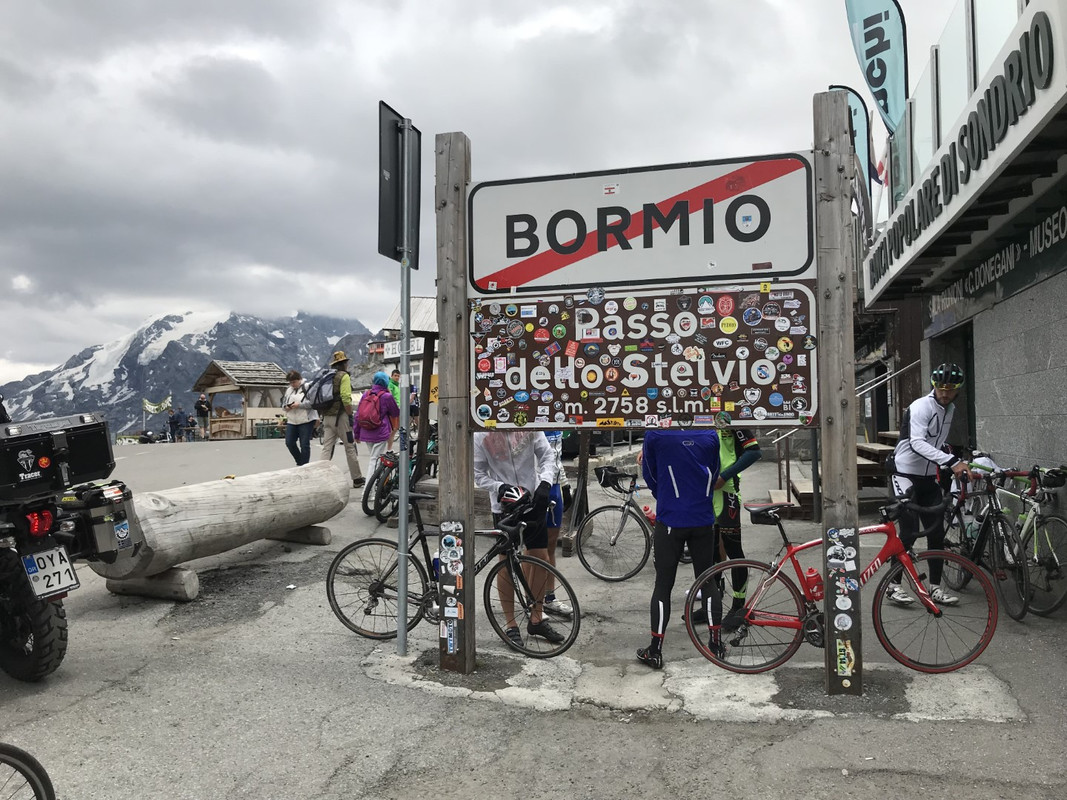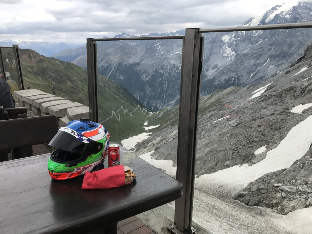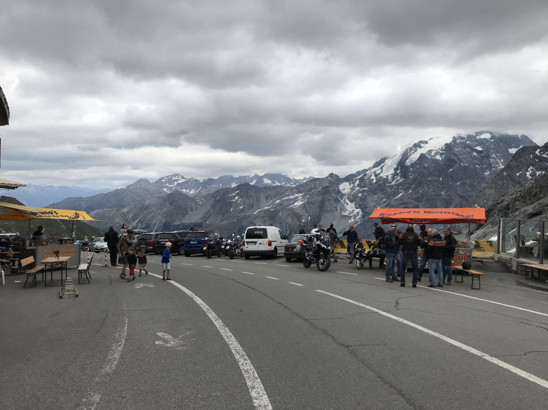 Finalmente surge o topo, um verdadeiro circo com lojas de souvenirs, estacionamento de carros e motos raros e exoticos um pouco por todo o lado e a vista panorâmica e pitoresca da estrada que desce a recortar a montanha. Ha tambem outra coisa que é a grande tradicao do Stelvio, as bancas de Wurtzel e a obrigatoria salchicha com sauerkraut (ou não estivessemos no Tirol) com todos os molhos a que se tem direito... dificilmente o menu para o Almoço seria melhor!