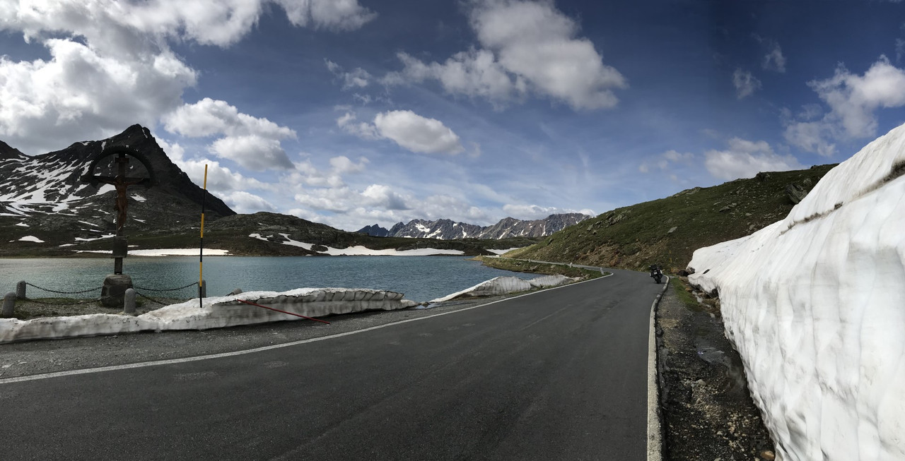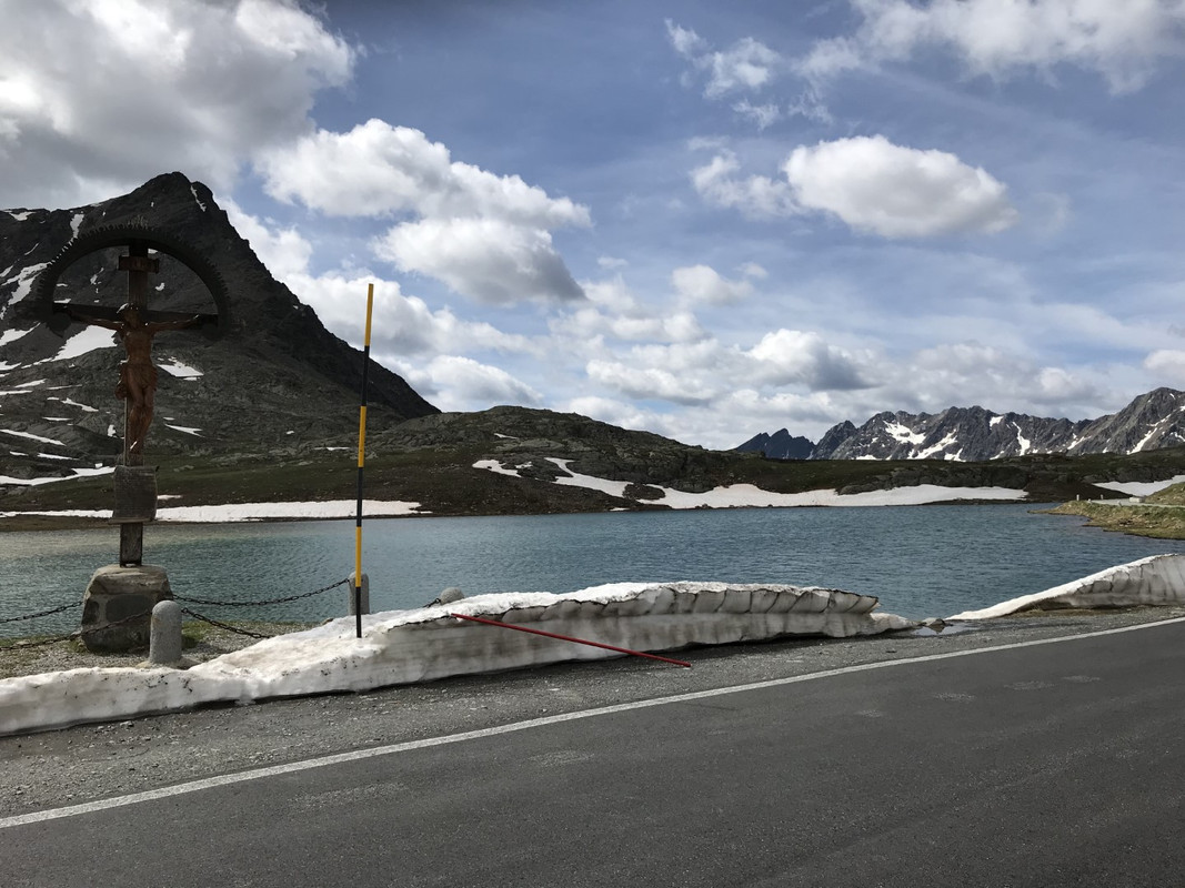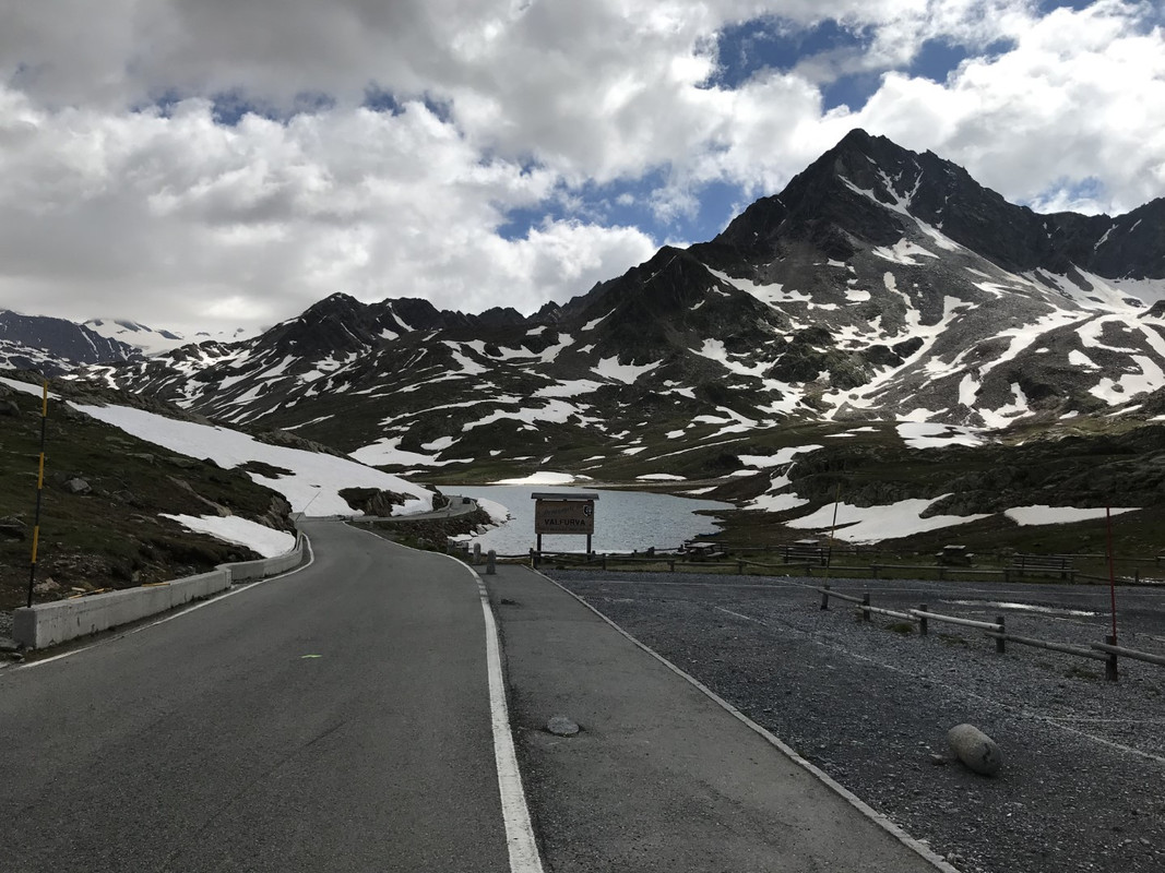 O gradiente é brutal e rapidamente o navigator indica que estamos acima dos 2500 metros sendo a rapidez na subida sido acompanhada de uma descida igualmente fulgurosa na temperatura para menos de 10 graus. O topo tem uma longa zona de plateau com lago e uns monumentos, cheguei la acima precisamente as 10 da manhã e rapidamente me deram as más notícias: a parte norte do Gavia estava fechado para reasfaltar (esta parte é uma excelente noticia!), de repente fico cercado por uma dúzia de Indianos todos em GSs com matrícula de Munique (alugadas) que estão em pânico pois acham que tem que ir dar a volta a Aprica pra regressar a Bormio. Acabo por lhe explicar que 10 ou 20 quilômetros mais à frente tem o passo Martirolo que segue paralelo ao Gavia e é precisamente para lá que vou.