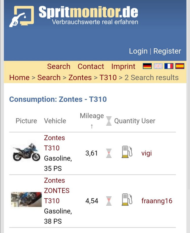 Neste caso, do motor 310 da Zontes, a média de que o Sapiens21 apresentou exemplo acima (não sei a metodologia), 4.3 lts/100 não anda longe dos escassos exemplos ainda existentes no spritmonitor, 2 motos, 11 215 Kms, 42 abastecimentos, 474 lts, 4.23 lts/100, um com 3.61 e outro com 4.54.