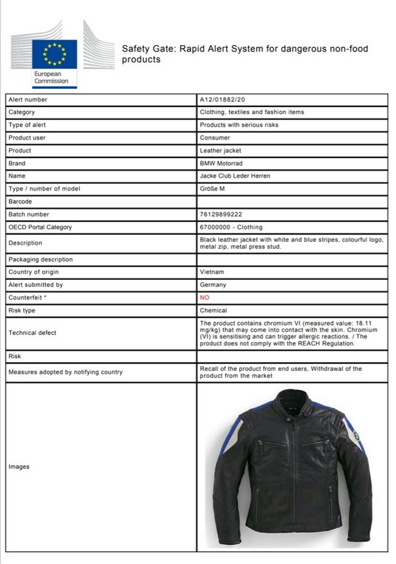 "(....)BMW Motorrad – Leather jacket. The product contains chromium VI (measured value: 18.11 mg/kg) that may come into contact with the skin. Chromium (VI) is sensitising and can trigger allergic reactions. The product does not comply with the REACH Regulation.(....)"