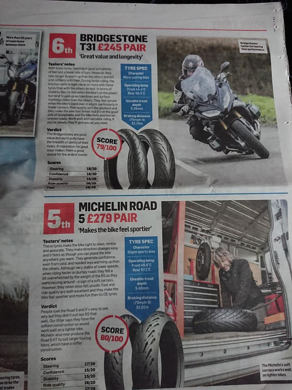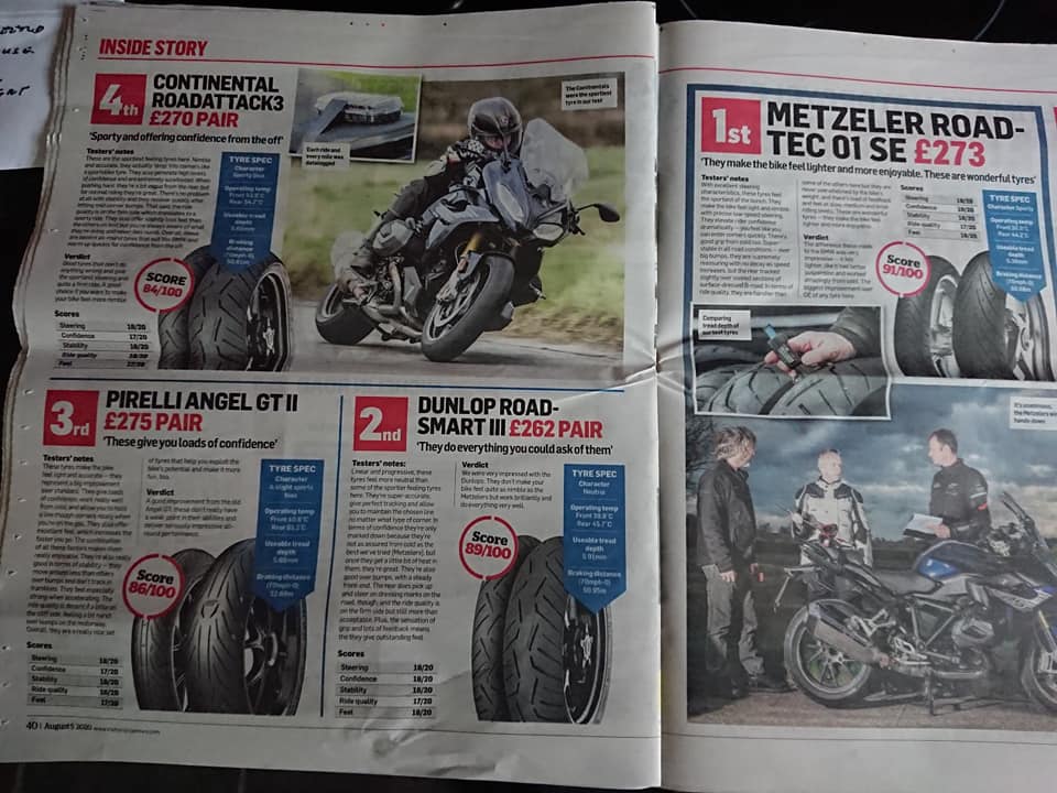 No seguimento deste antigo tópico e desconhecendo qual o jornal inglês de motociclismo que publicou um recente teste, partilho as páginas do respectivo jornal e teste a pneus de sport-touring: