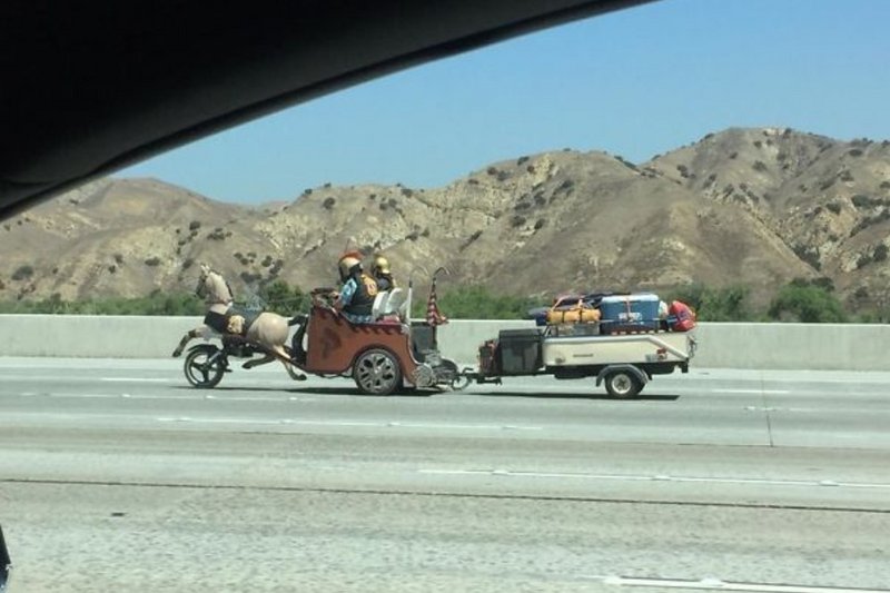 Aconteceu nos States (só podia!) e aquilo que foi captado de dentro de outro veículo ilustra...uma espécie de moto (só com alguma boa vontade, mas pronto), que funde um cavalinho de carrocel com uma carruagem romana...e que ainda se dá ao luxo de levar atrelado.