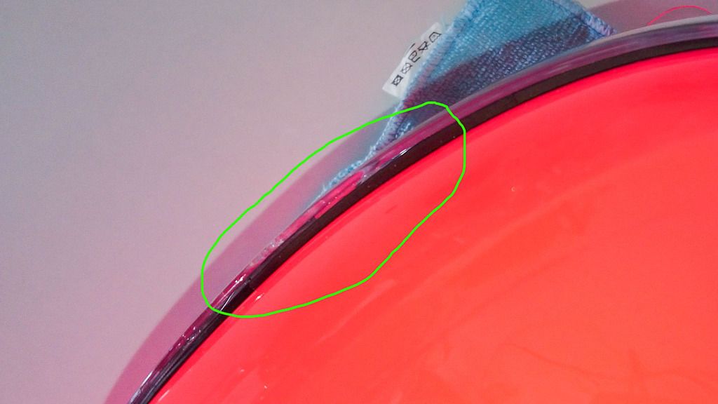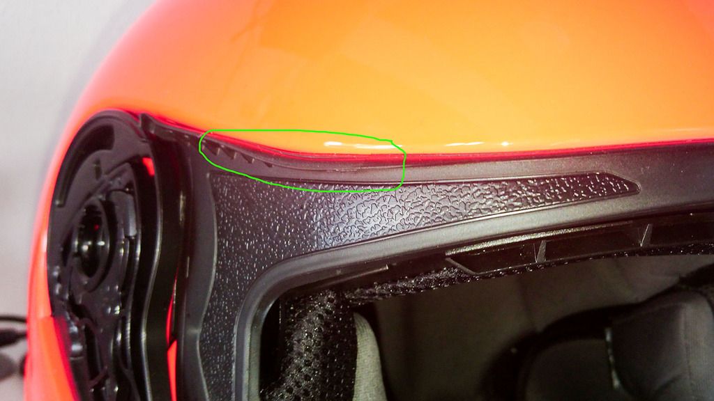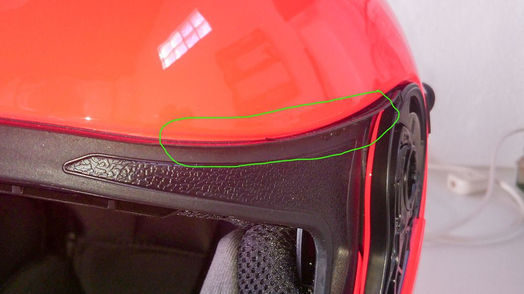 A dita nesga na união da viseira com a borracha (é pequena mas penso que dá para ver)A aba na borracha no lado direito do capacetee o lado esquerdo que é por onde entra a água todae um video exemplificativo do problema