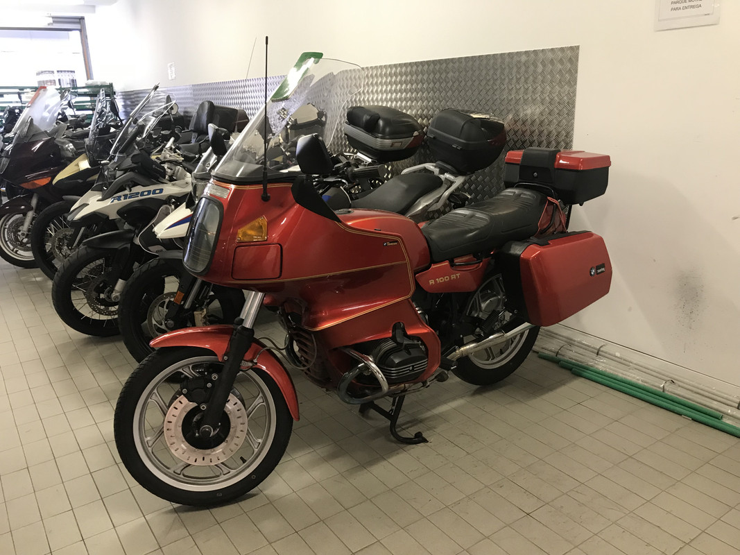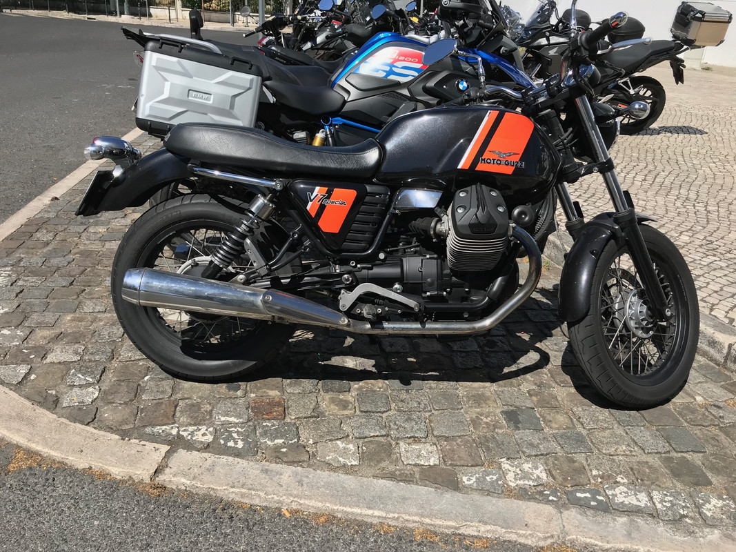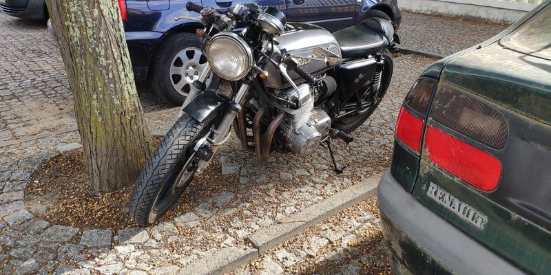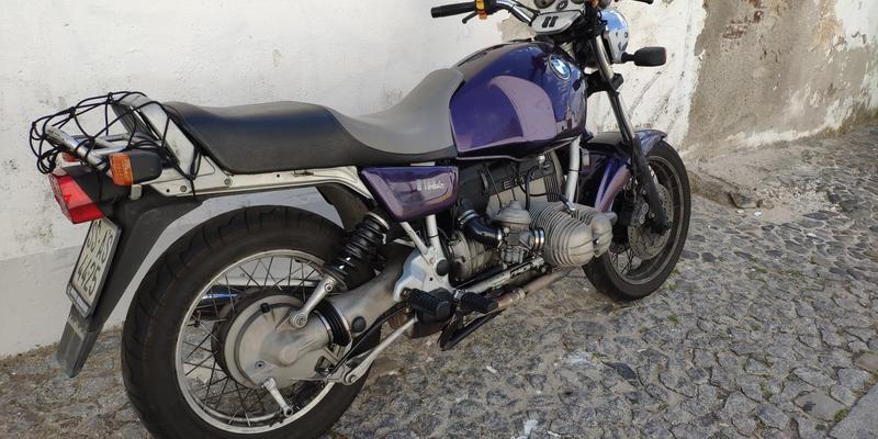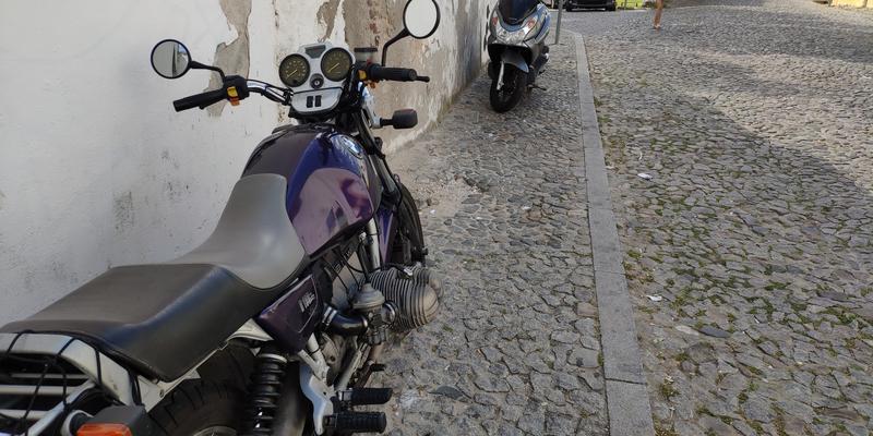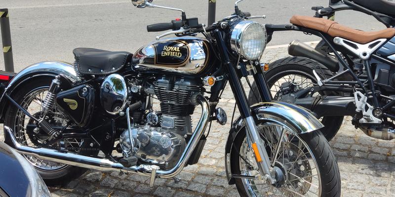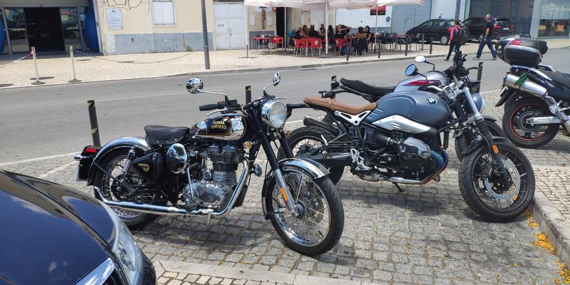 Avistei esta lindíssima Royal-Enfield junto ao Motoclube de Setúbal.No meio de um conjunto de várias motos, foi a única que conseguiu levar a que naquele momento sacasse do telemóvel para tirar um par de fotos. Nota: a RnineT logo ao lado também está Top, claro.