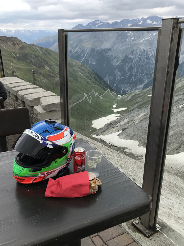Bonita zona essa por onde andas, com o serpentear da estrada de serra a ver-se ao fundo.Estás bem acima do nível do mar. Deve estar assim p'ró frescote...e compreendo o dispensar do gelo na cola. Zona montanhosa do norte de Itália?