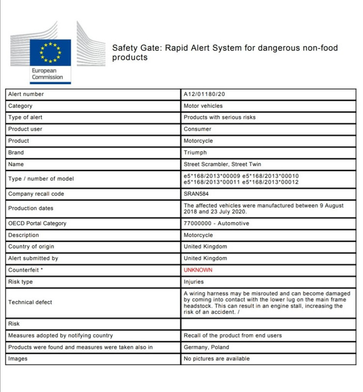 "Triumph – Street Scrambler, Street Twin. The affected vehicles were manufactured between 9 August 2018 and 23 July 2020. A wiring harness may be misrouted and can become damaged by coming into contact with the lower lug on the main frame headstock. This can result in an engine stall, increasing the risk of an accident. "