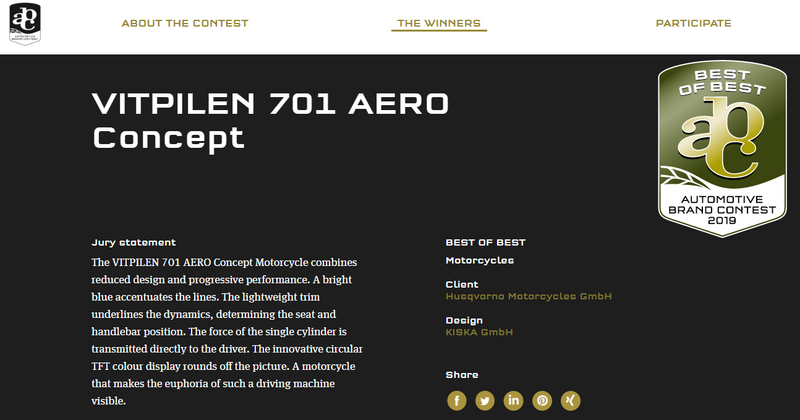 O resultado desta colaboração entre os austríacos de design da KISKA e da Husqvarna, levaram a que o design desta moto conseguisse alcançar um (ainda maior) reconhecimento, neste que é um evento mundial e julgado de forma independente, onde se procura e se dá o destaque a produtos que não só são brilhantes, mas que sobressaem do meio das demais marcas e modelos.