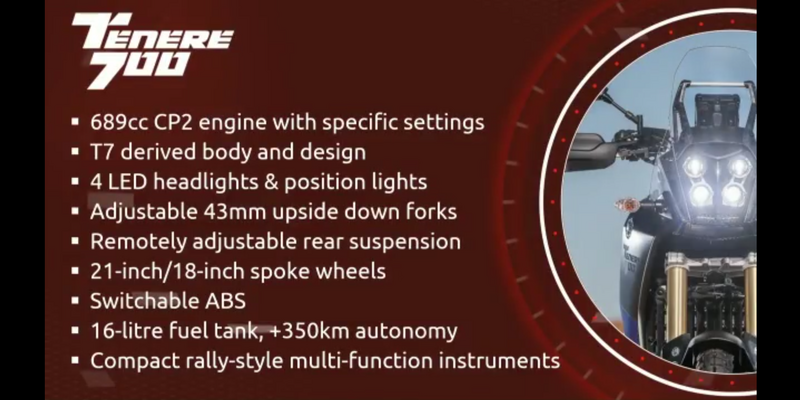 Não achei a apresentação nada de especial. Em termos de apresentação, a Tenere 700 não se destacou por aí além dos restantes modelos.