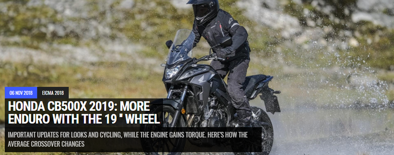 "ENDURO STYLE Ever more adventurous, the Honda CB500X . Tokyo's medium crossover arrives at Eicma 2018, bringing about important updates, for ever more versatile use. On all a new biconical handlebar and the 19-inch wheel on the front.