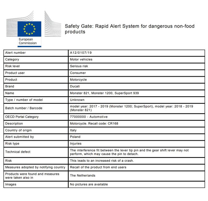 Recall Ducati: Monster 821, Monster 1200, SuperSport 939