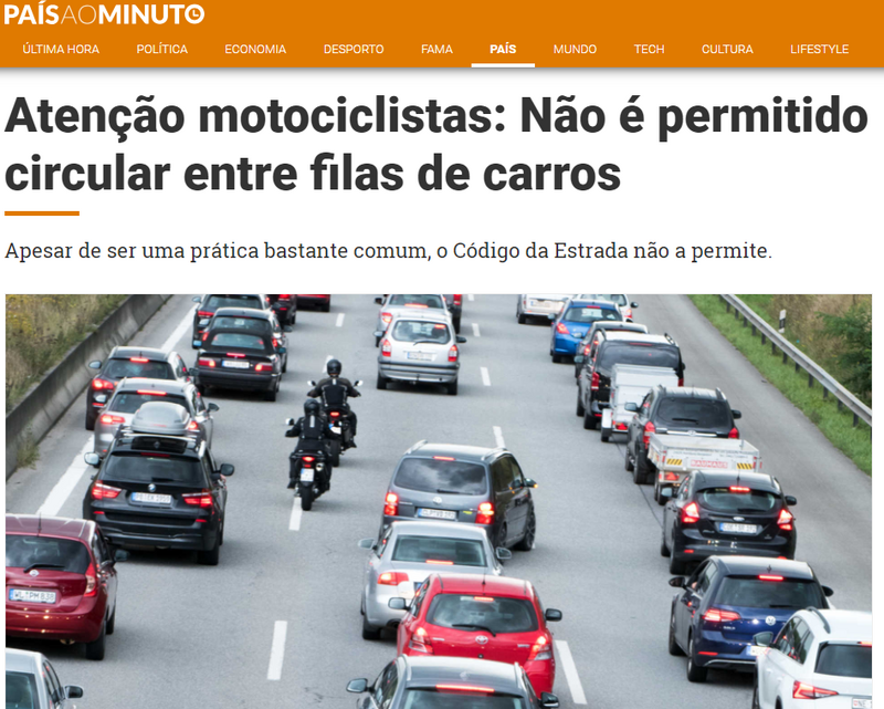 A visão é comum e acontece praticamente em todas as vias, sobretudo quando os engarrafamentos são mais intensos: os condutores de motociclos aproveitam o espaço por entre os carros, para assim escaparem ao tráfego. Contudo, essa prática pode levar a coimas, além de ser perigosa.De acordo com o Código da Estrada, as definições de ultrapassagem entre veículos não faz distinção entre condutores de automóveis ou de motociclos, pelo que as regras que lá constam são idênticas para ambos. Entre os motociclistas, a prática é conhecida como ‘lane splitting’ ou ‘filtering’, com estes a argumentarem que é uma forma de escaparem ao trânsito e de não causarem mais engarrafamentos, mas a ultrapassagem pelo meio de carros (ora pela esquerda, ora pela direita) perfaz uma manobra ilegal à luz da legislação do Código da Estrada.Assim, na Secção V, dedicada a “Algumas manobras em especial”, é descrita a forma de ultrapassar, com a Subseccção II, referente à Ultrapassagem, indica logo no seu Artigo 36.º, Regra Geral 1, que “a ultrapassagem deve efetuar-se pela esquerda” e que “quem infringir o disposto no número anterior é sancionado com coima de 250€ a 1250€”.Mais à frente, no Artigo 38.º, Número 3, aponta-se que “para a realização da manobra, o condutor deve ocupar o lado da faixa de rodagem destinado à circulação em sentido contrário ou, se existir mais que uma via de trânsito no mesmo sentido, a via de trânsito à esquerda daquela em que circula o veículo ultrapassado”. O número 4 desse mesmo artigo refere ainda que o “condutor deve retomar a direita logo que conclua a manobra e o possa fazer sem perigo”, com a coima resultante desta manobra a variar entre os 120€ e os 600€.Por último, o Artigo 41.º, sobre “Ultrapassagens proibidas”, tem no seu ponto 1, alínea g a indicação de que a manobra de ultrapassagem é proibida “sempre que a largura da faixa de rodagem seja insuficiente”.