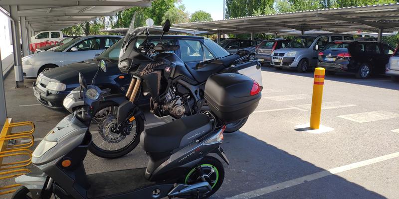 Uma mera curiosidade com que me deparei...Este é o exemplo pragmático da diferença na altura de assento entre modelos...e que neste caso nada têm que ver um com o outro. Nada mesmo...Ambas no descanso central, a altura do assento entre a pequena eléctrica e a Adventure é muito notória.Parecia o pónei ao lado do cavalo lusitano.