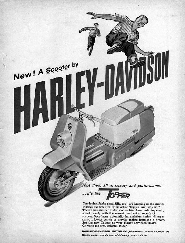 Essa tentativa terá sido única, uma scooter lançada em 1959 que certamente recebeu muitas criticas face aos "patriotas amaricanos de meia idade" e juntando a imagem de marca que a HD também ganhou com o Elvis Presley aparecer com modelos dessa marca...