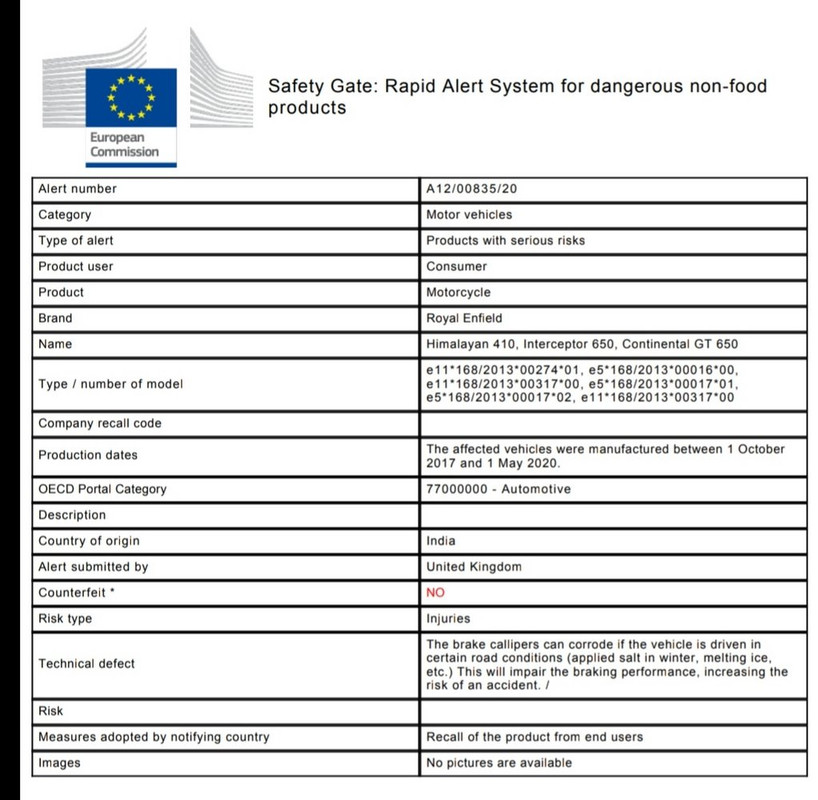 "Royal Enfield – Himalayan 410, Interceptor 650, Continental GT 650. The affected vehicles were manufactured between 1 October 2017 and 1 May 2020. The brake callipers can corrode if the vehicle is driven in certain road conditions (applied salt in winter, melting ice, etc.). This will impair the braking performance, increasing the risk of an accident."