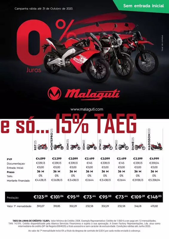 Citação de: ThatsMe em Agosto 13, 2020, 17:35:54, 17:35Caro 2low, A TAN e a TAEG são conceitos muito diferentes.Extremamente resumido:-> TAN = % de juro que a financeira ganha por te emprestar dinheiro-> TAEG = % de encargo extra que terás, alem do valor emprestado, incluindo juros.O MTIC é calculado a partir da TAEG, onde são incluidos juros, todas as despesas de dossier, comissões de processamento, imposto de selo e afins.Neste caso, a TAN é efetivamente 0. Assim sendo, o crédito é efetivamente 0% de juros. Isto não quer dizer que não tenhas despesas associadas ao crédito (TAEG).Posso-te dar um exemplo muito prático: Se por algum milagre um banco te fizesse crédito habitação sem juros, ias ter que desembolçar uns bons milhares só para despesas de crédito, imposto de selo e comissões de processamento.Importante não confundir: Um crédito 0% de juros pode ter uma TAEG de 50%... A TAN é que tem que ser obrigatoriamente 0%.Obrigado pela explicação! Ainda assim pode servir para tentar perceber o porquê das MT07 usadas afinal possam ter um valor que se ajuste ao real valor de uma MT07 adquirida a crédito, que deverão ser quase todas na sua maioria... (comparando MT07 com 1/2 anos)Mas sobre as campanhas de 0% juros, não deixam de serem enganadores porque um consumidor vai ter a liberdade de pensar que afinal tanto lhe vai custar uma coisa a pronto como outra a prestações... quando na prática tal não ocorre... e o preço final é bem superior ao preço inicial sem financiamento pelo que... Ou seja... mudam apenas o balde pois a... é a mesma!