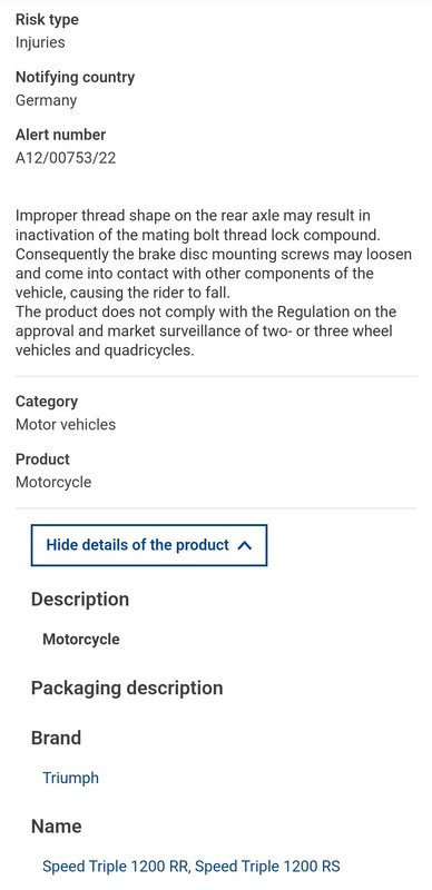 "Triumph – Speed Triple 1200 RR, Speed Triple 1200 RS. Production dates: 1 September 2020 – 13 February 2022. Improper thread shape on the rear axle may result in inactivation of the mating bolt thread lock compound. Consequently the brake disc mounting screws may loosen and come into contact with other components of the vehicle, causing the rider to fall."