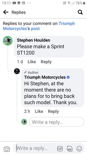 Estava na expectativa que esta nova Speed Triple 1200 RR fosse uma moderna semi-carenada mas assim...Pode ser que haja alguém que goste... talvez os mesmos que gostem da MVAgusta Superveloce...Mais info: https://www.motorcyclenews.com/news/new-bikes/triumph-speed-triple-rr/Esta moda dos retrocoisas... (apesar de mecanicamente até dever ser fabulosa...)Já agora...Dfelix tinhas razão em todos os teus comentários sobre esta daytona ou futura sprint, quando disseste que "quanto muito uma semi-carenada":(imagem retirada de um grupo inglês das Triumph Sprint ST 1050 em que a marca Triumph dá para ver que interage também nas redes sociais....)Videos oficiais: