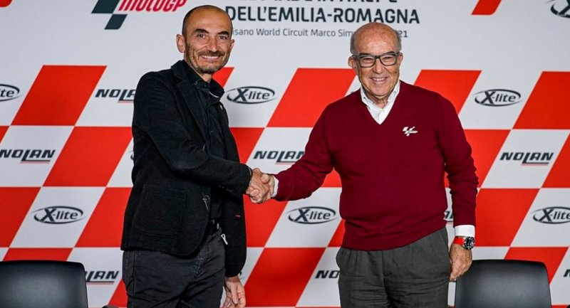 O CEO da Ducati, Claudio Domenicali (à esquerda) e o CEO da Dorna Sports, Carmelo Ezpeleta (à direita).