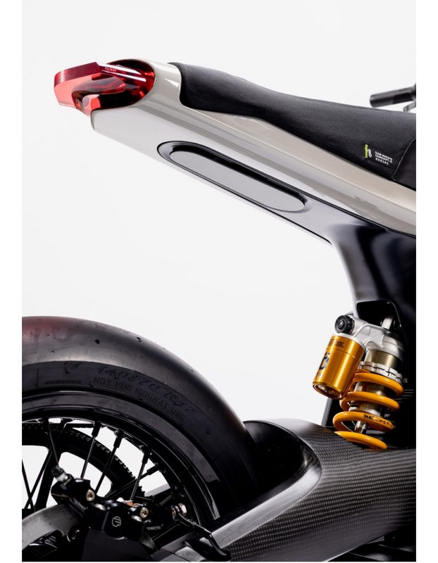 E depois equipou-a com suspensões Öhlins que foram projectadas especificamente para este modelo; os travões são de alumínio e desenvolvidos pela Beringer CNC; conta com um acionamento por correia Gates, que opera em polias usinadas em alumínio, para maximizar a potência e minimizar o ruído.