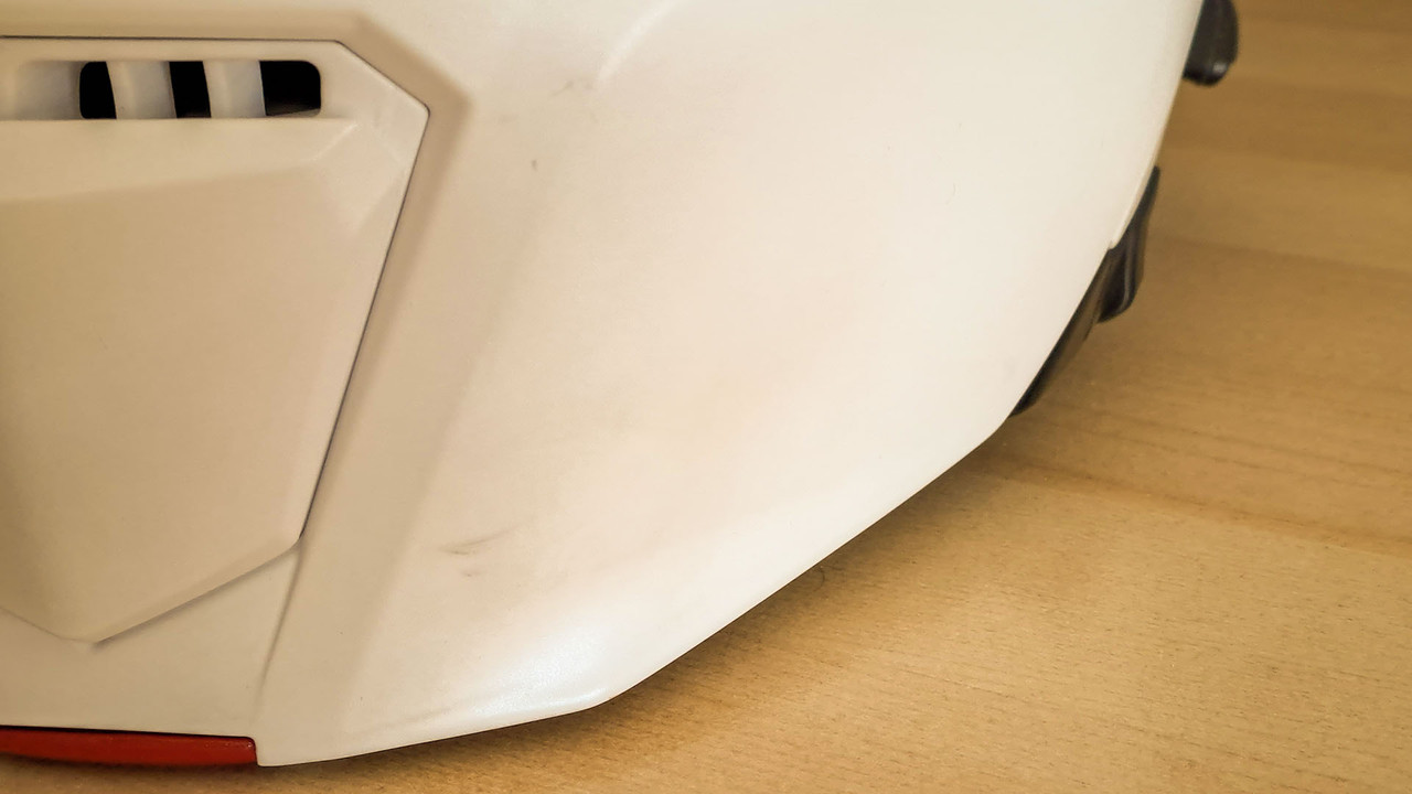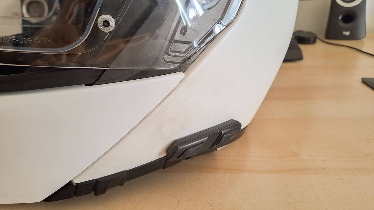 Uma coisa que já me arrependi foi ter ter comprado na cor branco mate, pois suja-se com bastante facilidade onde qualquer dedada fica logo marcada e os mosquitos agarram-se com muito mais facilidade ao capacete. A zona circundante dos botões do intercom está toda mascarrada devido às luvas tocarem no capacete quando uso os botões assim como a zona da queixeira onde agarro para a fechar.